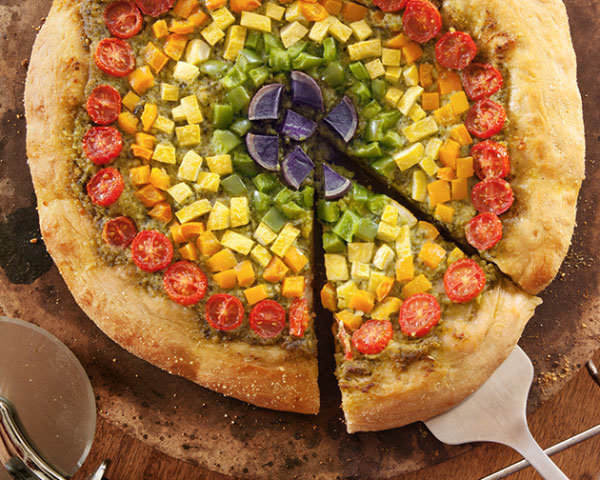 - Preheat oven to 400 degrees. Arrange potatoes on a baking sheet. Roast for 20 minutes. Roll the pizza crust out on a flat surface. Evenly spoon the pesto over the crust. Arrange the vegetables in the order of the colors of a rainbow. Place back in the oven and bake 20 minutes.