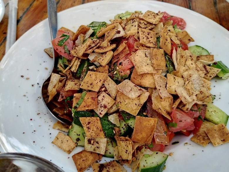 Popular throughout the Middle East and Mediterranean, there are many variations on Fattoush but the salad always has crispy pita chips as a main component. Using leftover pita is an excellent way to use food scraps to make a delicious meal. In this rendition, crispy pita, tomatoes, green onions, cucumbers, olives, parsley and cilantro are tossed with a simple dressing of olive oil and lemon juice for a fresh and crisp side.