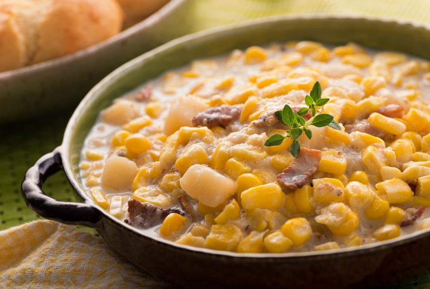 Fresh sweet corn plays nicely with shellfish, especially clams, in this delicious take on chowder. This recipe is complex, but very comforting and easy to prepare at the same time. The addition of thick-cut bacon lardons brings a smoky element to the soup that balances out the whole dish.