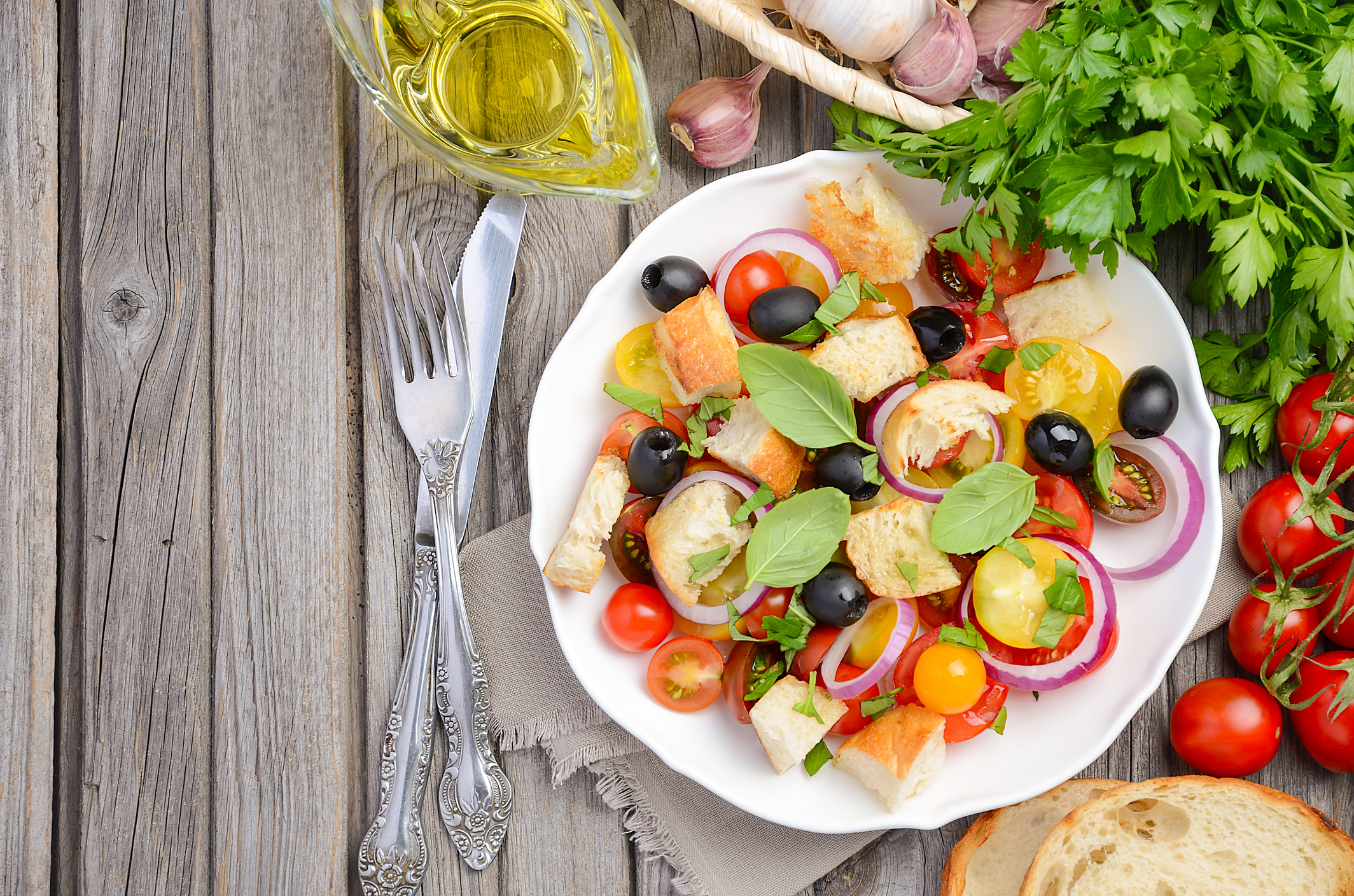 This bread salad is a Florentine favorite that is especially popular in summer. The basic ingredients are day-old bread, tomatoes, onions, basil, and a dressing made out of olive oil and vinegar, but you can get creative and add whatever vegetables look the best at the market. Make it a full meal by adding some nicely grilled chicken for extra protein.