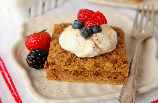- To serve, cut into 6 equal-sized bars and place on serving plates. Top each square with a dollop of Greek yogurt, surround with fruit, and drizzle with honey. Sprinkle with nutmeg or cinnamon and serve immediately.