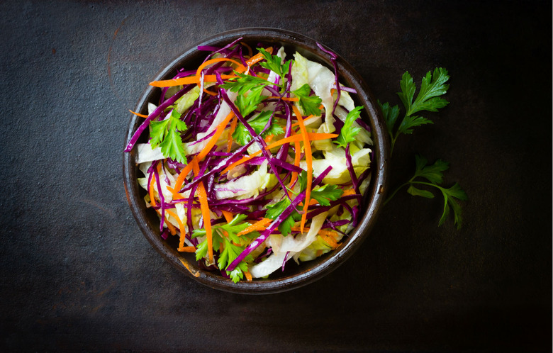 - Add red cabbage and carrot to the kale, and mix together. Pour in your desired amount of dressing, and mix to coat the slaw.