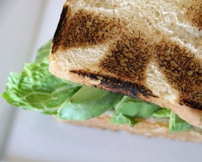 - Thickly layer the roast turkey on the bottom slice (one with only one side covered with the spread). On top, place the slice that has the spread on both sides. Cut romaine to fit the sandwich and layer several pieces on top. Layer the sliced avocado, and 4 slices of roma tomato so that tomato covers every part of the square. Layer the slices of bacon the same way, so that in every bite you will get tomato and bacon. Slice in half or quarters.