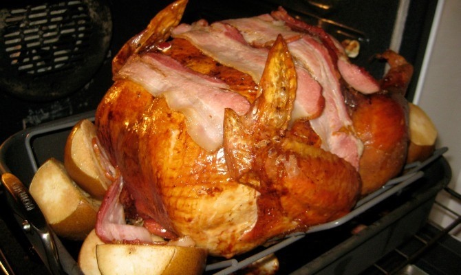 - Wash the turkey inside and out and pat dry. Mix together the seasonings, minced garlic, and olive oil to make a paste. Rub the paste underneath the skin of the breasts of the turkey, carefully so you do not tear the skin (you may not have to use all of the paste). Add 1-2 cups of water in the roasting pan, then roast the turkey in the oven for 30 minutes. Remove from the oven and turn the heat to 350 degrees. Cover the turkey in the bacon slices, in cross-hatch form or just by overlapping the slices in strips. Put back in the oven and continute to cook for about 2 more hours or until an internal thermometer temperature reaches 160 degrees.