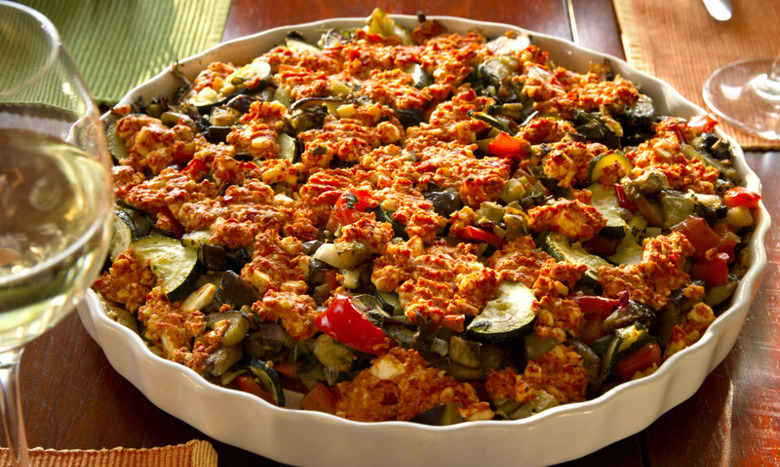 Baked eggplant, gently cooked tomatoes, plenty of spices, and chickpeas are baked together, and served sprinkled with refreshing herbs and crunchy pomegranate seeds.This recipe is courtesy of Meat Free Week.