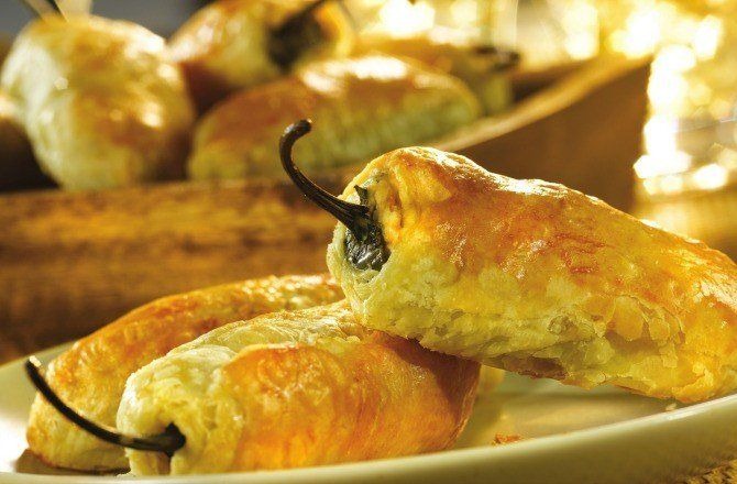 - Place 1 filled pepper half diagonally, cheese-side down, onto each pastry square. Fold the pastry up over the pepper and press firmly to seal. Brush the filled pastries with the egg mixture. Sprinkle with additional shredded cheese, if desired. Place the pastries onto 2 baking sheets.