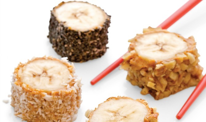 - When the entire banana is coated in nut butter, roll it in a healthy topping like chia seeds, (unsweetened) shredded coconut, crushed pretzels, or chopped nuts.