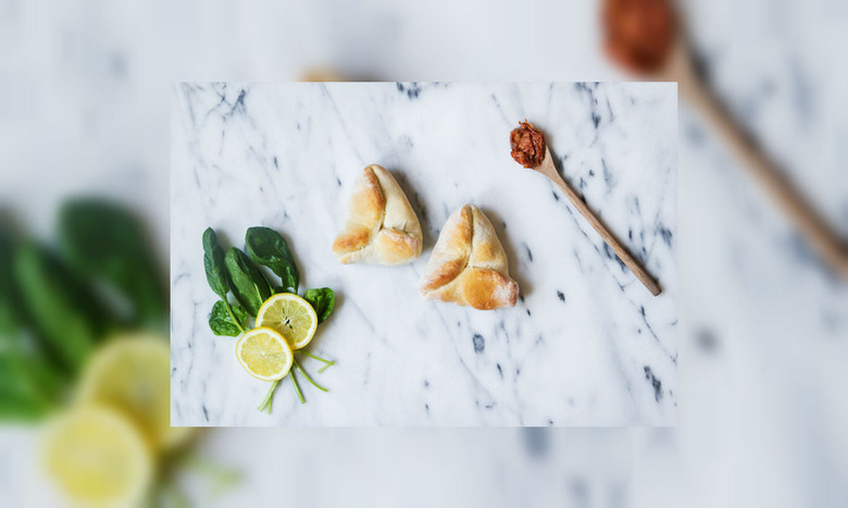 - Take golf ball-sized pieces of dough and roll each piece of dough into 1/8-1/4 inch thin circles on a flour surface. Add 1-2 tablespoons of the spinach and Bar-B-Que Jackfruit mixture in the center. To fold into triangles, fold one side halfway over the spinach mixture. Dip your finger in the water and moisten around the edge of the remaining circle. Fold the second edge (of three), overlapping the first fold to make a corner. Fold the remaining edge to make the triangle. Press to seal. Brush each spinach pie with olive oil and place on prepared baking sheet.