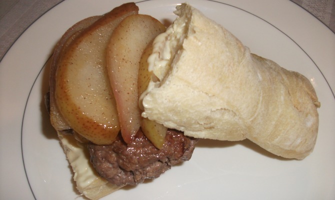 - Place the burger on the ciabatta bread, add a few slices of pear to each burger, and top with arugula.
