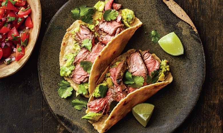 - To serve, spread guacamole on each tortilla. Top it with the beef and pico de gallo and finish the tacos with a squeeze of lime juice.