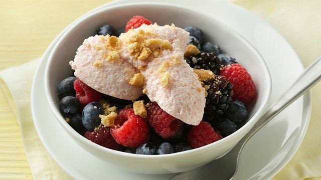 - Place berries in small bowl or cup. Top with yogurt mousse and crumbled cookie.