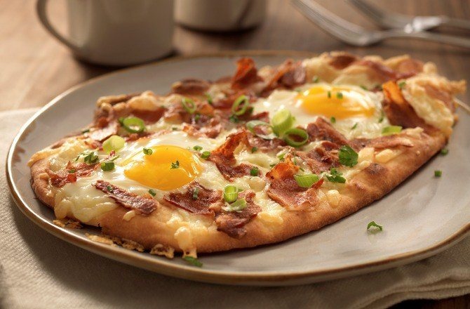 - Lay the naan bubble-side up on a baking tray, sprinkle with the parmesan and mozzarella cheeses and the cooked bacon. Crack 2 eggs on each naan and season with salt and pepper.