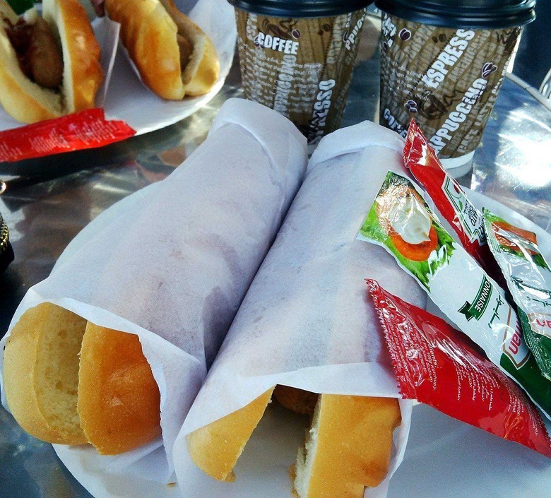 - Grease another pan and put on low heat. Brush melted butter onto the inside of the hot dog bun and place butter side down in the pan until slightly toasted. Use tongs to remove the buns from the pan and onto a plate. Scoop hot dogs and eggs into the bun and top with your favorite condiment. Enjoy!