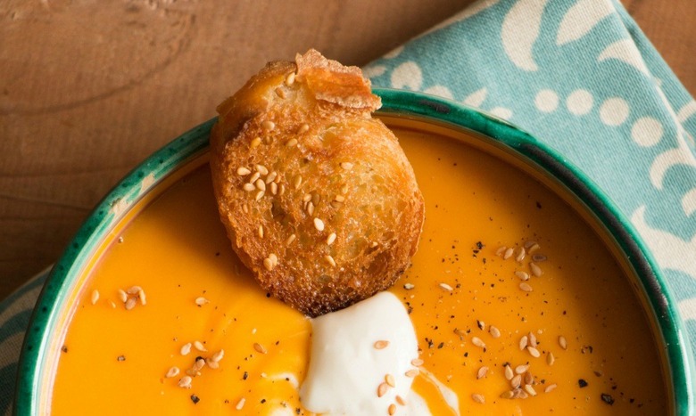 - Once it's fully cooked, take the stockpot off the heat and transfer the squash, broth, and onions to a blender. Depending on how much soup you're making, this might need to be done in two batches. Also, be careful, because this is hot! Blend the soup until the squash and onions are broken down into a puree.