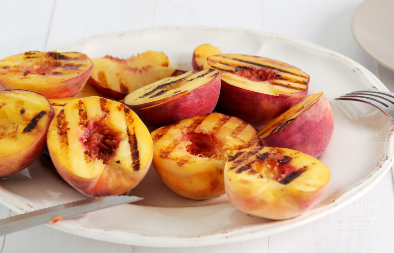 - Wash peaches and slice in half, removing the pit. Arrange the 4 peaches, cut side down, on top of the pecans. Drizzle with remaining caramel sauce.