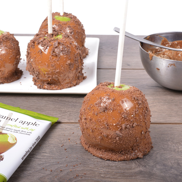 - Roll chilled apples in Caramel Apple Crush pieces until evenly coated. Place back in fridge for 15 minutes.