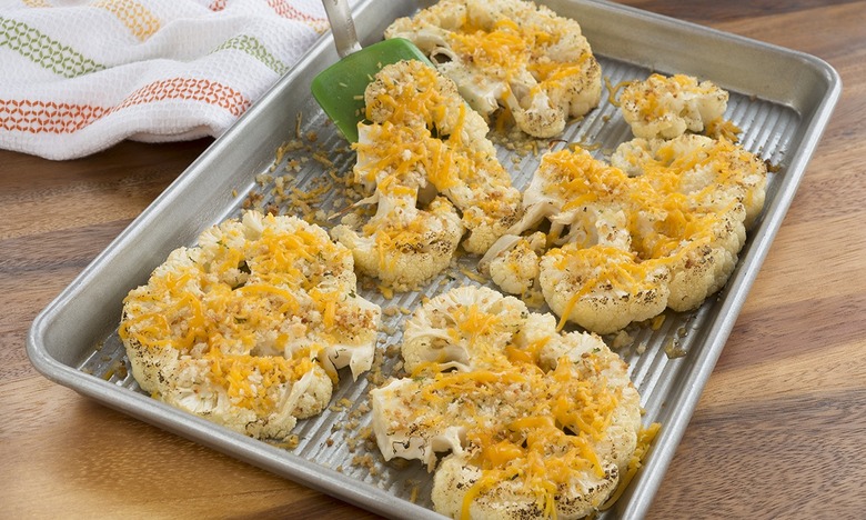 - Cut cauliflower in half down center. Cut two 3/4-inch thick slices from each half and arrange on baking sheet. Brush tops with remaining 3 Tablespoons Spread. Sprinkle with bread crumbs, gently pressing to adhere.