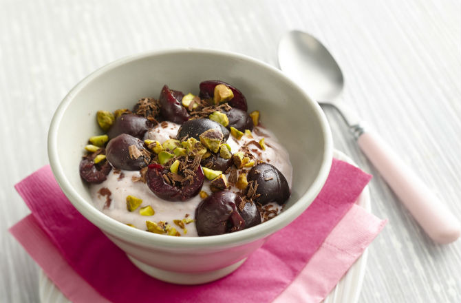 Cherries, pistachios, and chocolate make this yogurt bowl delicious and indulgent!See more Yoplait recipes here.