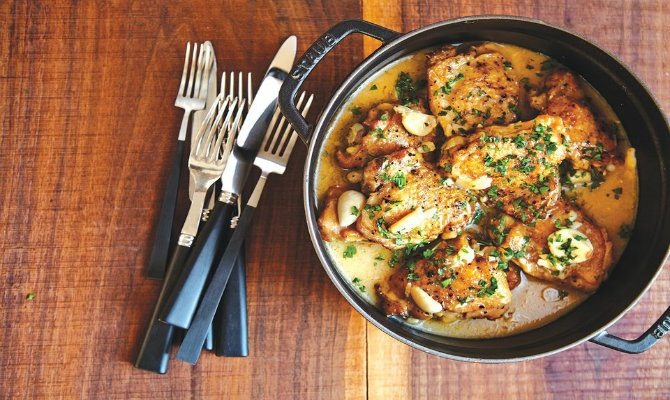 The slow cooking of the garlic makes this dish sweet, nutty, and creamy. Some folks like to cut up a whole chicken, but I prefer all thighs—they braise well and the meat stays juicy. I used Champagne because I love the subtle flavor it adds, but any dry white wine could be substituted.Excerpted from Essential Emeril: Favorite Recipes and Hard-Won Wisdom From My Life in the Kitchen by Emeril Lagasse. Copyright © 2015 Emeril Lagasse dba MSLO Acquisition sub, LLC. Reprinted with permission from Oxmoor House, an imprint of Time Inc. Books. All rights reserved.