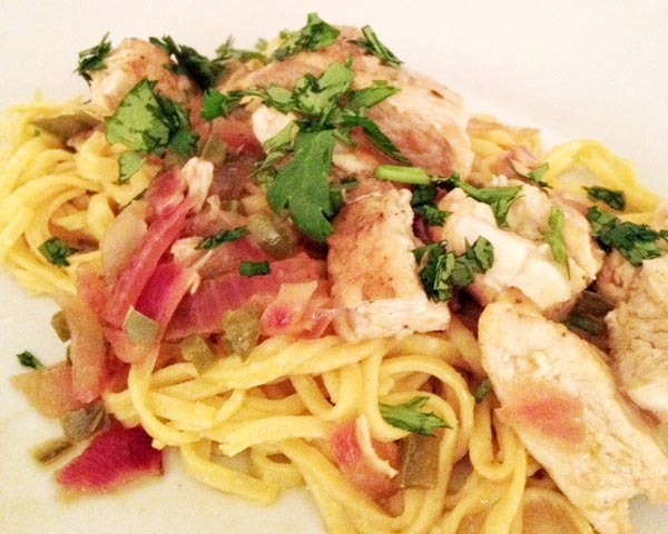 - Heat coconut oil in a medium skillet over medium high heat. Add the onion and jalapeño. Cook for 3 minutes until softened. Add in the chicken stock and reduce. Add in the chicken pieces and cook until heated through and chicken stock is reduced by half. Add in the orange juice, lime juice, and season with salt and pepper. Spoon sauce and chicken over pasta and garnish with cilantro.