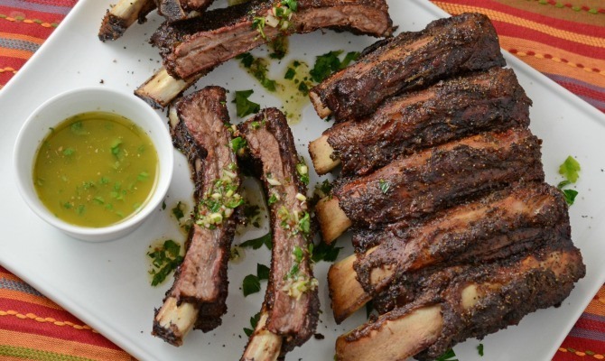 - Put the parsley, garlic, onion, oregano, 2 teaspoons of salt, the red pepper flakes, 1 teaspoon of black pepper, and the red wine vinegar into a bowl. Slowly pour in the olive oil while you vigorously whisk the contents of the bowl. Reserve ½ cup of the marinade for use as a condiment after cooking. Slather the ribs with the remaining chimichurri and refrigerate overnight, or 8 hours. Set up your grill for indirect heat and preheat it to a grate-level temperature of 225 degrees F. Remove the ribs from the marinade and wipe off any excess. Season liberally with black pepper.Place the ribs on the cooker, bone-side down, and slow roast until they reach an internal temperature of 200 degrees F, about 3-4 hours depending on the thickness of your ribs.Once the ribs hit 200 degrees F, season them lightly with salt and immediately spritz or baste the ribs with the beef stock. Place the ribs back on the grill for 5 more minutes.