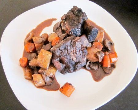 - The next day, remove the solidified fat from the top of the cooking liquid. Remove the short ribs from the cooking liquid and set aside. Place the pot back over the stove and add the carrots, mushrooms, and potatoes. Cover with the lid, and bring to a simmer over high heat.