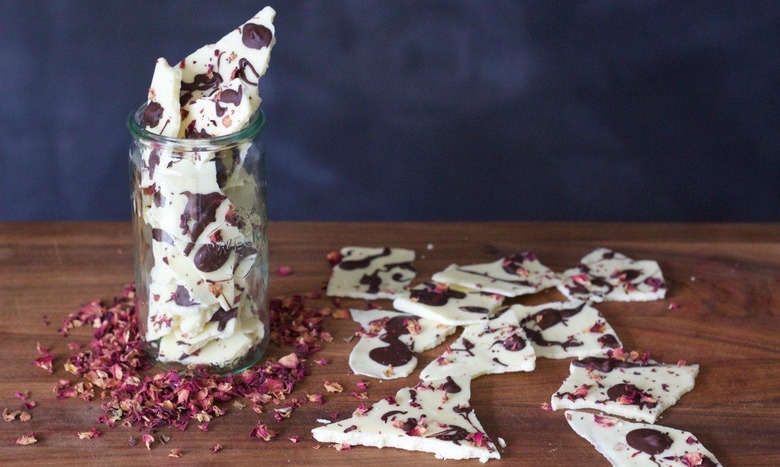 - Sprinkle the edible dried rose petals over the chocolate. Place the pan in the refrigerator for 20 minutes to set.