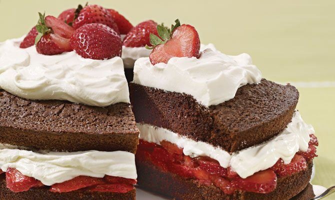 - Microwave chocolate with Country Crock® Spreadable Butter With Canola Oil in large microwave-safe bowl at HIGH 1-1/2 minutes or until chocolate is melted; stir until smooth. Beat in 3/4 cup sugar and vanilla with electric mixer on low speed. Beat in eggs, then 1/4 cup flour, baking soda and salt. Alternately beat in remaining 1 cup flour and water until blended. Pour into prepared pan.Bake 30 minutes or until toothpick inserted into center comes out clean. Cool 10 minutes on wire rack; remove from pan and cool completely.Meanwhile, combine strawberries with remaining 1 tablespoon sugar in medium bowl. To serve, slice cake in half, horizontally. Arrange bottom half of cake on serving platter. Evenly top with strawberries, then 1-1/2 cups sweetened whipped cream. Top with remaining half of cake and remaining whipped cream. Garnish, if desired, with additional strawberries.