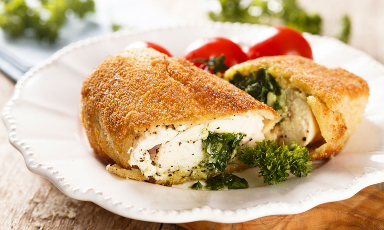 Chicken breasts stuffed with garlic butter and crispy bacon, and coated with golden breadcrumbs may just be our favorite-ever classic ‘60s dish.This recipe is courtesy of Jamie Oliver.