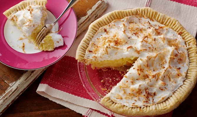 - Pour the hot filling into the piecrust. Quickly spread the meringue evenly over filling, starting at edge and sealing to the crust all around; swirl with back of spoon. Sprinkle with the coconut. Bake in the upper third of the oven until lightly browned, 16 to 18 minutes. Cool on wire rack for 1 hour, then refrigerate 3 to 4 hours before serving.