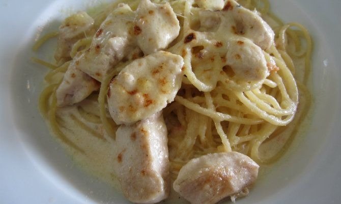 - Pour the Alfredo sauce over the pasta and chicken mixture and toss together, making sure to coat the chicken and pasta as much as possible. Serve warm.
