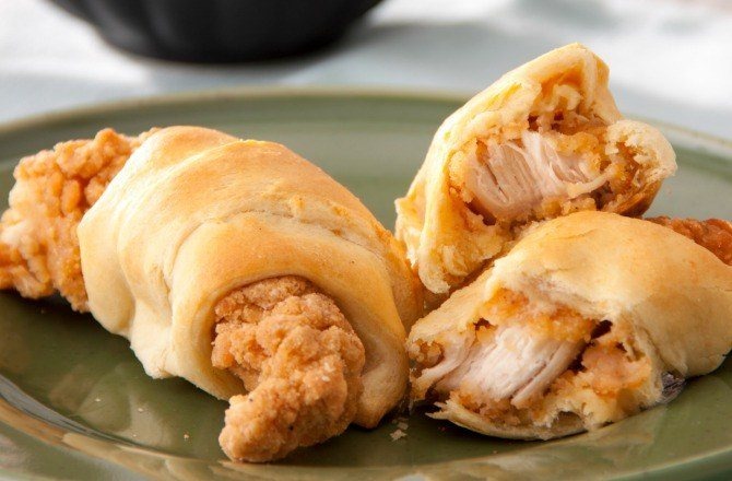 - Place chilled crescent roll dough triangles on a clean work surface and add a Chicken Strip. Wrap the dough around the chicken and place on an ungreased cookie sheet. Bake at 375 degrees F for an additional 10 to 12 minutes, or until the crescent rolls are golden.