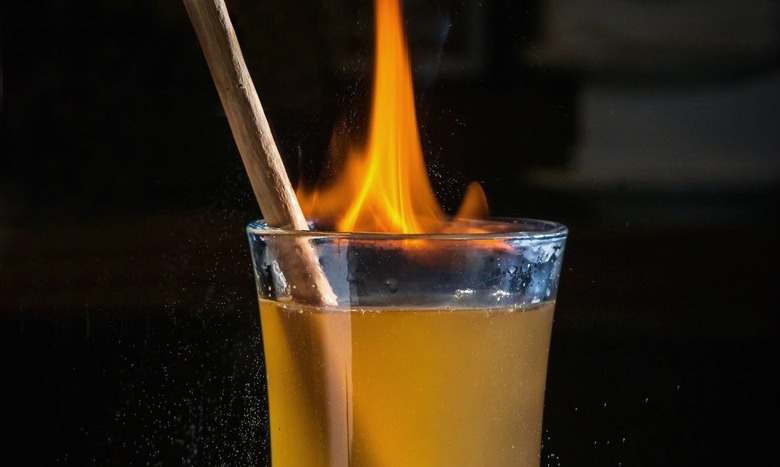 - Combine everything into a mixing vessel stir with a bar spoon. Heat your glass with hot water to be sure the glass isn't cold, when ready to pour contents into glass pour out the hot water now strain in your cocktail add hot water on top about 4 ounces of hot water. Garnish with a cinnamon stick and a flamed orange peel.