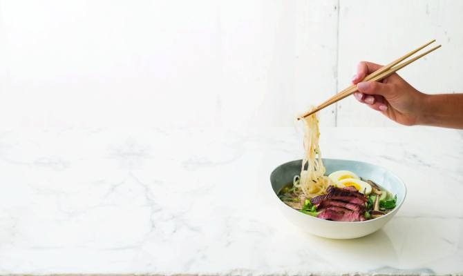 - Thinly slice the flank steak against the grain. Serve the ramen in portions topped with the steak slices and the egg halves.