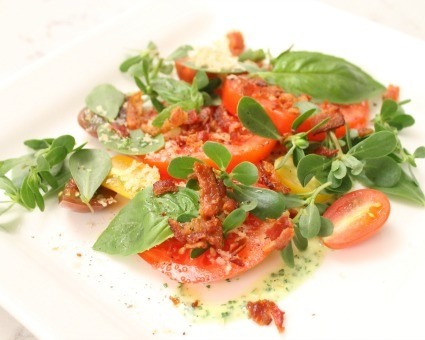 - Divide the tomatoes on each salad. Crumble bacon over each salad and sprinkle on some of the toasted bread crumbs. Finish with a little Maldon salt and pepper.
