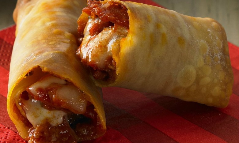 - Place one wrap on work surface with 1 corner facing you. Place about 2 tablespoons filling slightly below center of wrap. Brush all sides of wrap with water. Fold corner of wrap closest to filling over filling, tucking point under. Fold in and overlap right and left corners. Gently roll egg roll toward remaining corner and press to seal. Place on baking sheet. Brush with olive oil. Repeat with remaining wraps and pizza-filling mixture.