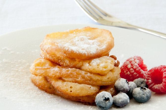 - Fill a deep, heavy pot with 3–4 inches of oil and heat to 325 degrees F. Carefully drop spoonfuls of batter into the oil and fry until puffed up and brown; turn over and fry until brown on second side.