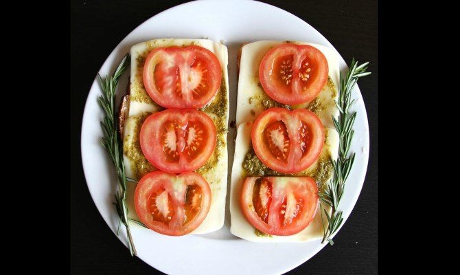 - Layer the cheese, pesto, and tomatoes on the bread before closing the sandwich.