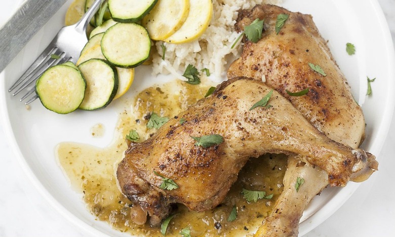 - Season the chicken generously with salt and pepper. Mix the garlic, cumin, and coriander in a small bowl, and rub it all over the chicken. Working in batches, brown the chicken on all sides, about 2 minutes per side.