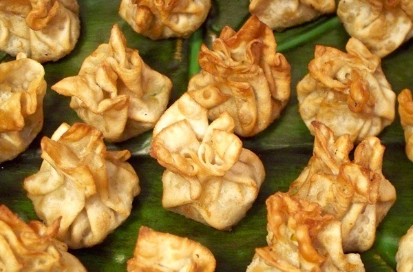 - To assemble, place one wonton wrapper on a secure work surface. Spread about 1 teaspoon of cream cheese in the center. Top with a couple pieces of the prepared beef, a couple pieces of chopped green onion, about ½ teaspoon of chopped green chile, and about ¼ to ½ teaspoon of the crushed pine nuts. Moisten the tips of your fingers with water and rub around the edge of the wonton wrapper. Bring the edges together and pinch, sealing firmly, and creating a small package. Repeat with the remaining wonton wraps. When all the wraps are filled, bring 4-inches of oil to a high heat in a 4-quart or larger saucepan. Gently drop in the beef bites and fry until crisp and golden, 1 to 2 minutes. Remove from the oil, drain on paper towels and arrange on a platter.