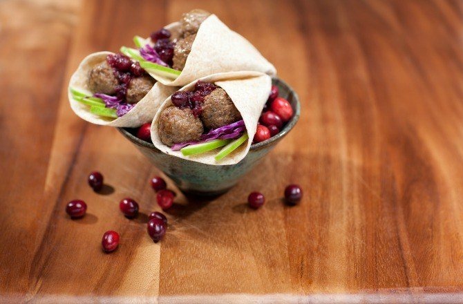 - Place 5 meatballs down the center of each tortilla. Spread 2 tablespoons cranberry sauce alongside the meatballs. Place three apples slices down the center of each tortilla; garnish with thinly sliced red cabbage.
