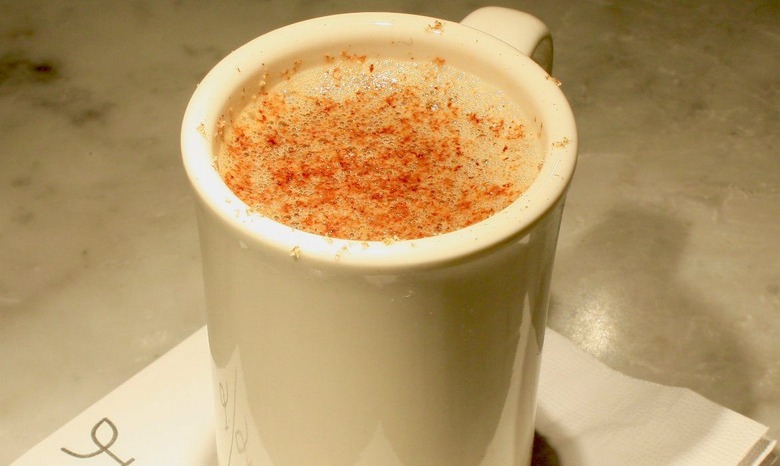 - Add all wet ingredients to a tin and whip (without any ice) until frothy. Pour into coffee mug. Top with hot water from the kettle. Top with freshly grated nutmeg on top. Serve in a coffee mug.