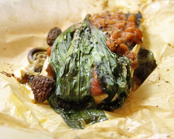 4. For each packet, ladle 1 tablespoon of mushroom duxelles in the center, place the fish on top, ladle tomato concassé on top of the fish. Layer the ramps over the concassé. Place the morel mushrooms along the sides of the fish.
