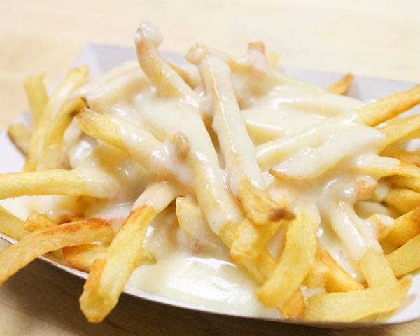 - In a small sauce pan, bring the white wine to a boil. Add the cheeses and whisk constantly, until the fondue is smooth and thin. Place the fries in a fry boat or shallow bowl and dress with the fondue.