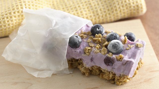 - Spoon yogurt over crust; gently spread to cover. Sprinkle with blueberries and crushed granola. Freeze about 3 hours or until firm.