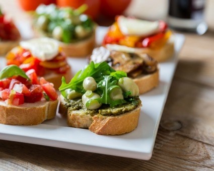 - Place a slice or dollop of goat cheese on each and top with a small spoonful of pesto. Garnish with basil sprigs and pine nuts. Serve immediately.