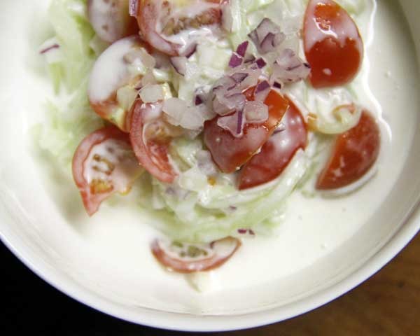 - Discard the cucumber water (unless you want to use it for a savory cocktail), and toss the with the yogurt-feta sauce. Add the minced onions and tomatoes, sprinkling a few undressed onions and tomatoes on top of the pasta and drizzling just enough "sauce" to mimic a pasta dish. Squeeze a bit of lemon juice over the dish, sprinkle a touch of salt, twirl, eat, slurp, and drink (the sauce).