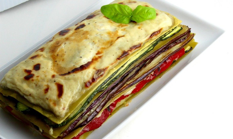 - Brush a baking dish the approximate size of lasagna sheets with a small amount of olive oil. Place one sheet of lasagna on the bottom. Layer with vegetables, mozzarella, béchamel, and lasagna sheets. Repeat. Top with last lasagna sheet with béchamel. Bake at 325 degrees F until heated through.