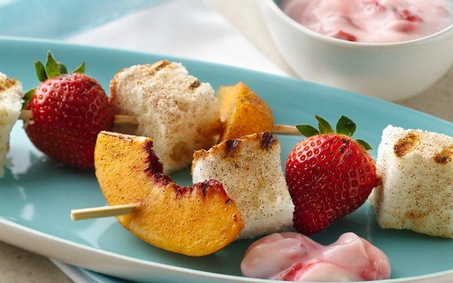 Cake cubes, strawberries and peach slices arranged on skewers for grilled kabobs and served with Yoplait Light yogurt – a distinctive dessert. Visit Yoplait.com for more summer treats and recipes.