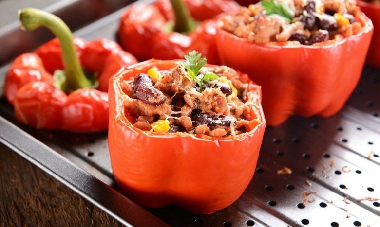 - While peppers are roasting, brown meat and chopped onions in a large skillet until cooked through. Add beans, cooked rice, corn, pico de gallo, spices, and stir over a medium heat until combined. Spoon meat mixture into upright, roasted peppers, and place back into oven for 15 minutes.